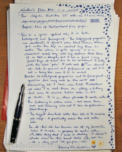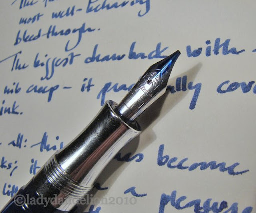 It looks really nice coming from that nib: I think it’s an ink which probably suits a broader line better. I have this ink, and thus far have only tried it in an EF Lamy 2000. As the pen is very smooth, I actually felt there was a bit too much lubrication, but it’s a nice shade of blue. I must try it with my italics, or a less smooth nib. Oh, and yes, it really does creep a lot! My whole nib was blue with it.