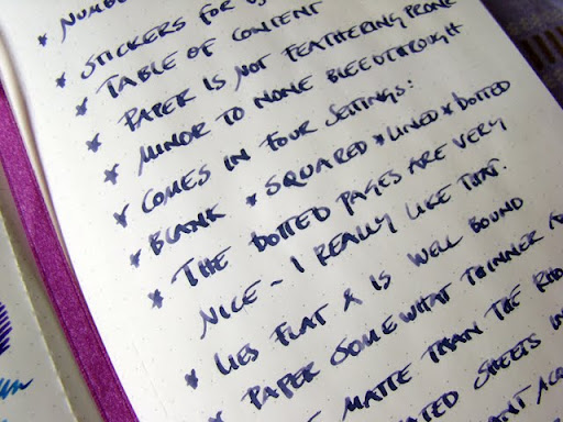 I would guess 80 or 90 g/square metre, though. For the review I chose the lilac medium-sized notebook with dotted pages. I was very curious to try to write on the dotted paper – neither blank or lined or squared. For a hard-core lover of blank paper (even if I’ve learned to like Rhodia web notebook whose only option is lined paper) it is surprising to learn that dotted paper is a serious alternative to both blank and lined paper. I am seriously considering making this dotted paper as a part of my regular arsenal.
