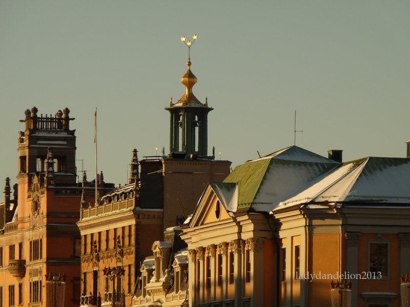 Stockholm City Hall and it’s golden crowns seen behind the facades of Norrmalm near Strömmen (the Stream)