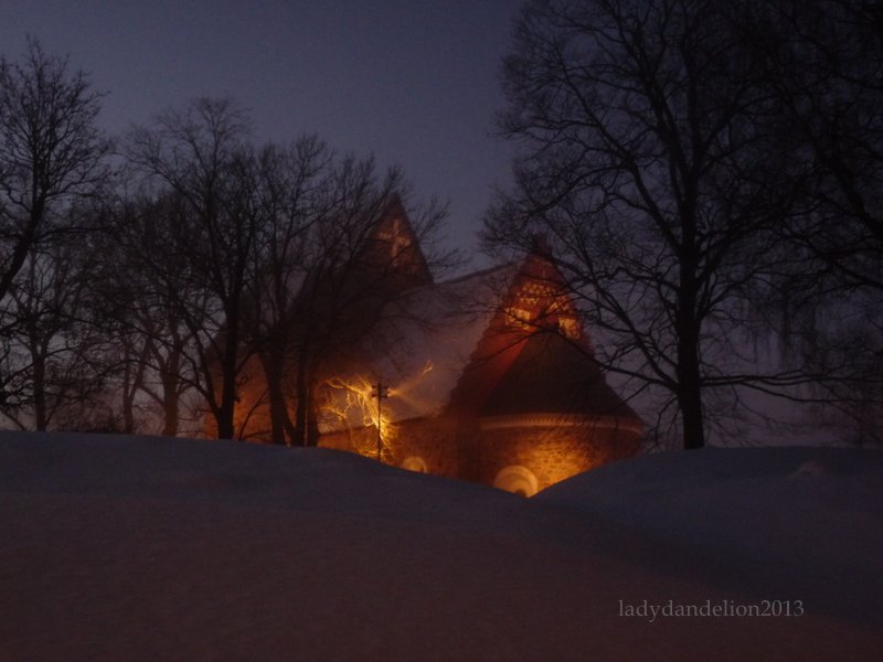 dusk is falling / Gamla/Old Uppsala Church is glowing like a lantern.