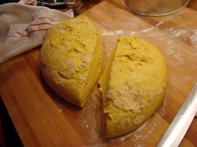 When the dough is ready (it shall become approx the double size) put it on the pastry board and knead it gently. Cut it into four pieces.